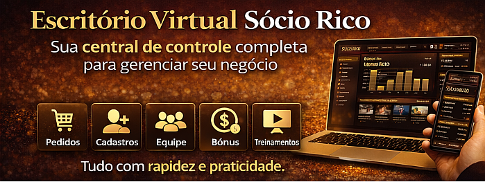 O Escritório Virtual Sócio Rico é a sua central de controle do membro. A partir dele, você realiza pedidos de produtos, acompanha novos cadastros, gerencia sua equipe, confere recebimento de bônus, acessa treinamentos e atualiza seus dados cadastrais com rapidez e segurança. O Escritório Virtual é o seu “control room” no Sócio Rico!